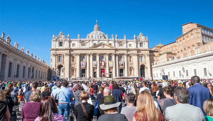 - Pilger und Besucher versammeln sich auf dem Petersplatz, um den Segen und die Belehrungen des Papstes zu empfangen.